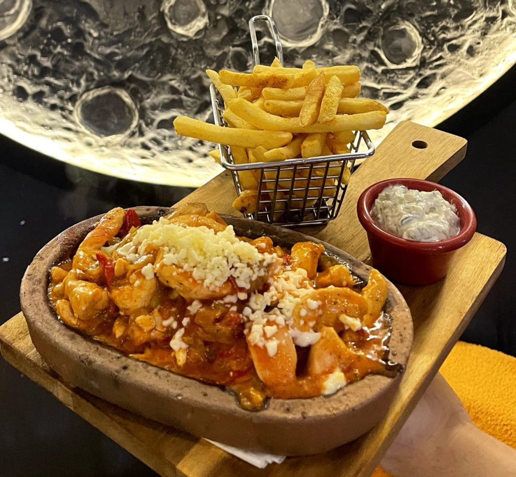 KAPADOKYA KEBABI İçindekiler: Kibrit patates üzerine marine edilmiş tavuk ızgara bonfıle, yoğurt ve demi glace sos ile servis edilir. Fiyat: 380₺